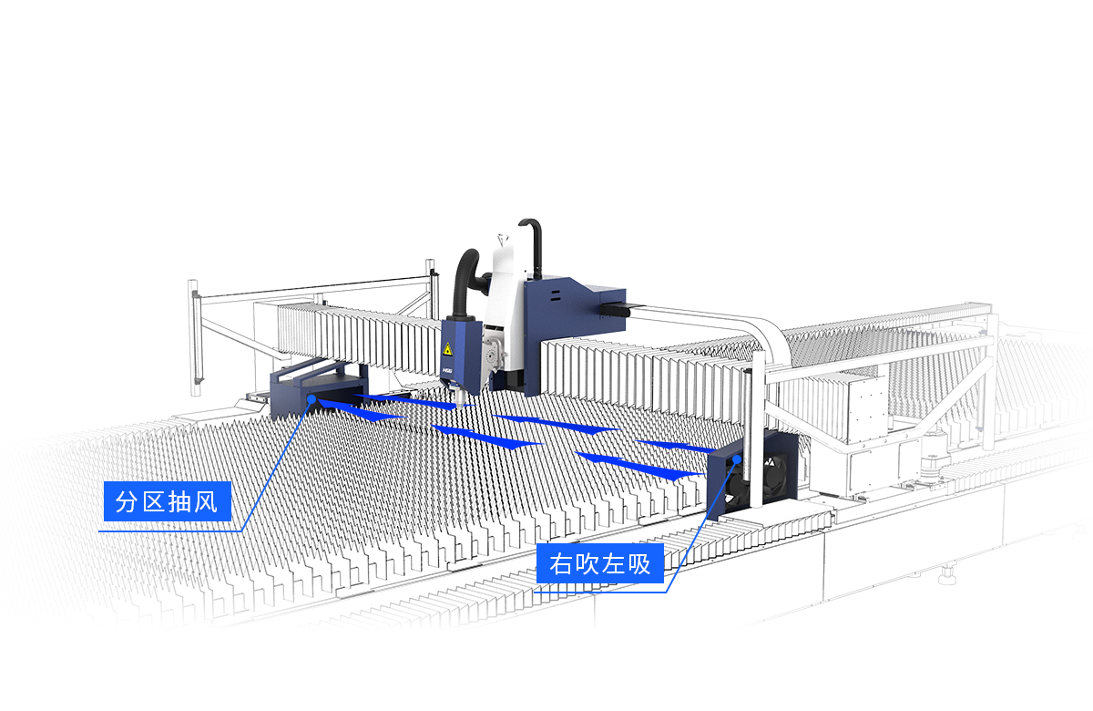 床身右側安裝有雙排吹風裝置,配合左側抽風機,一吹一吸,方便排出切割產生的煙塵,為您營造清潔干凈的工作環境。